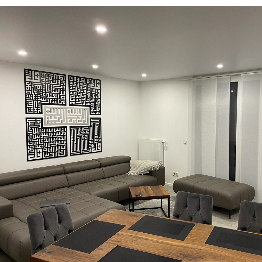 Elevate your space with the divine protection and elegance of the 4 Quls. This stunning Islamic wall art piece masterfully combines laser-cut MDF wood and radiant acrylic, featuring a central panel with sacred Arabic calligraphy surrounded by five decorative frames. Available in three sizes to grace any wall.