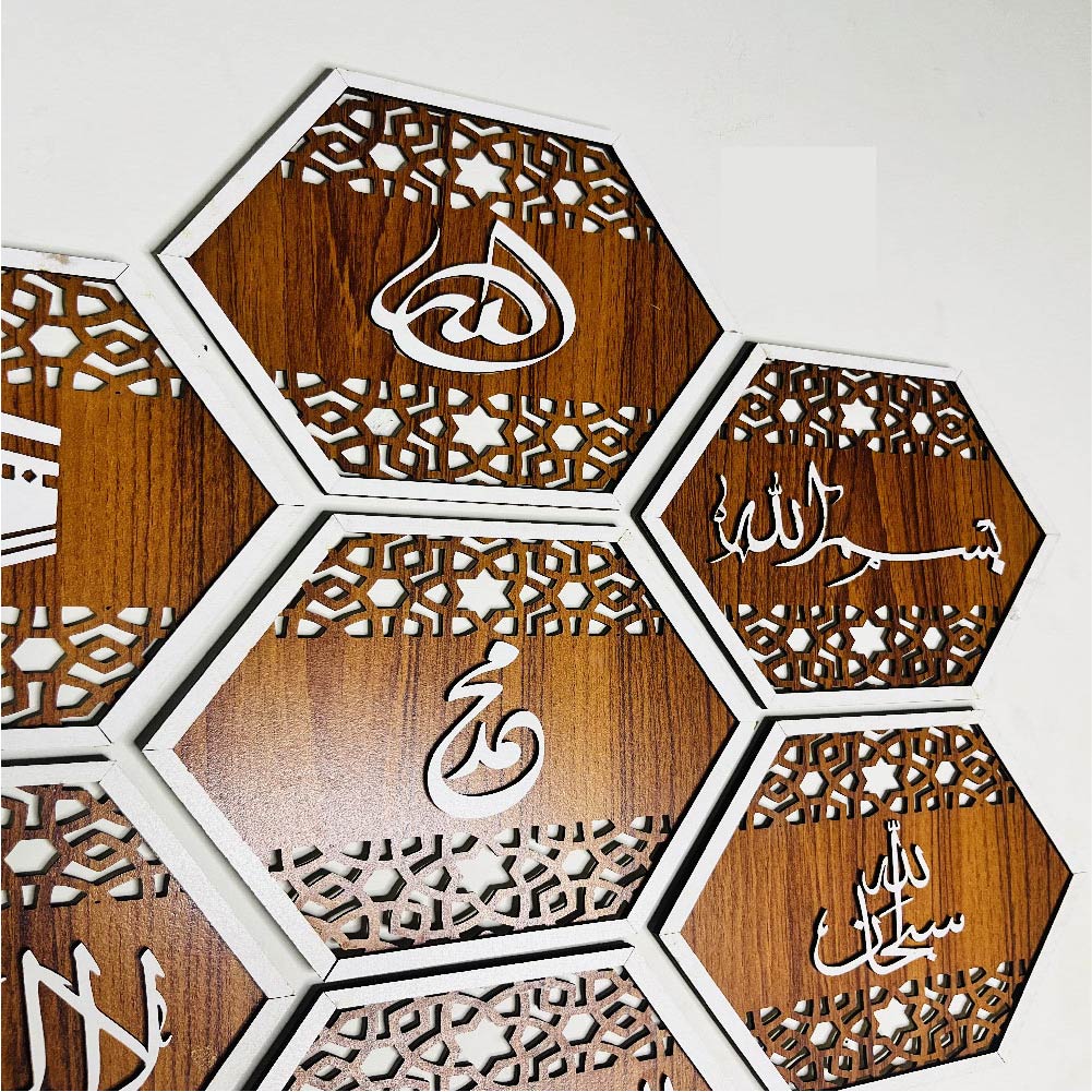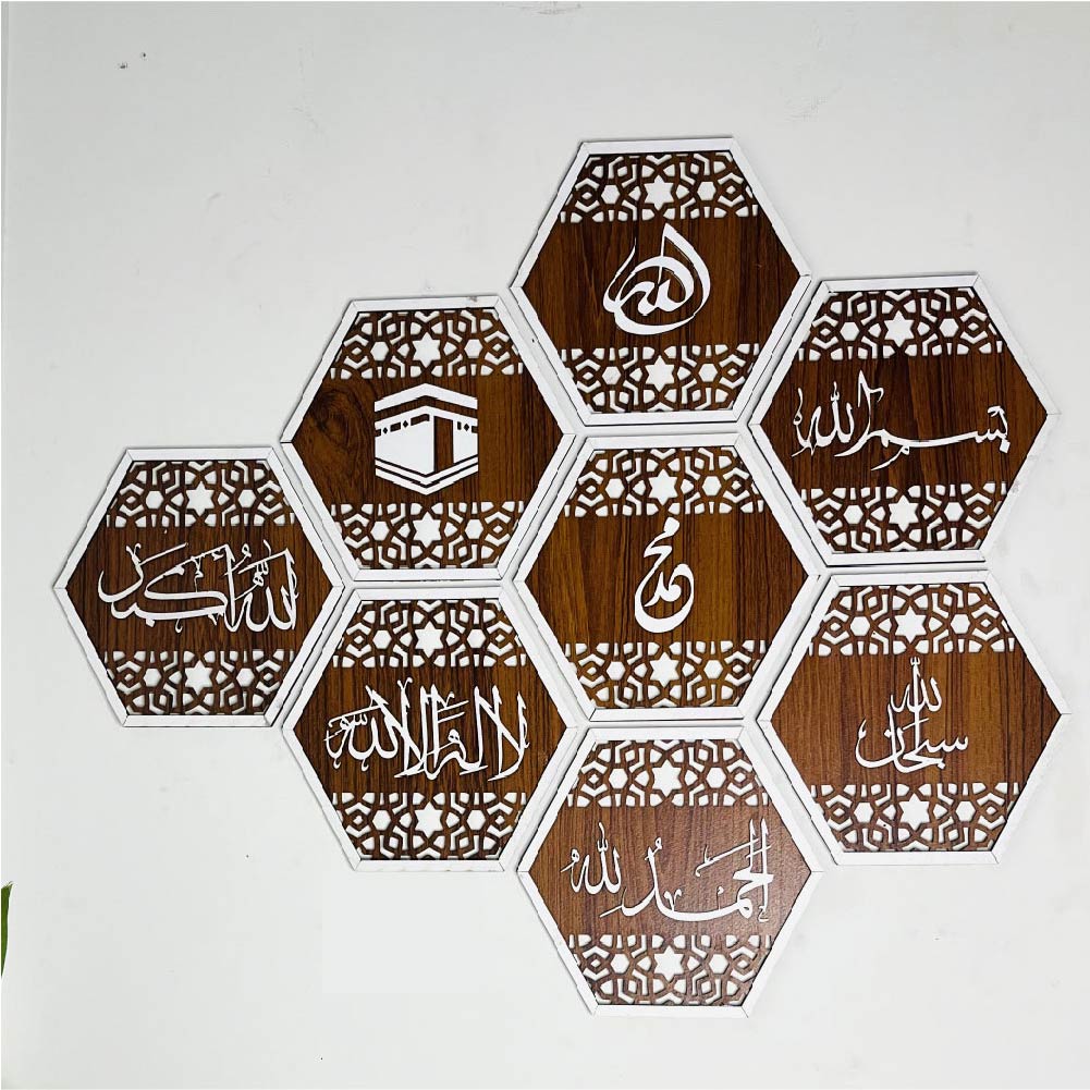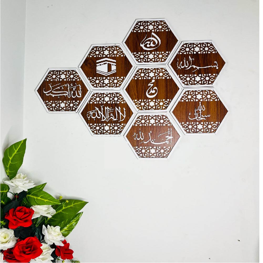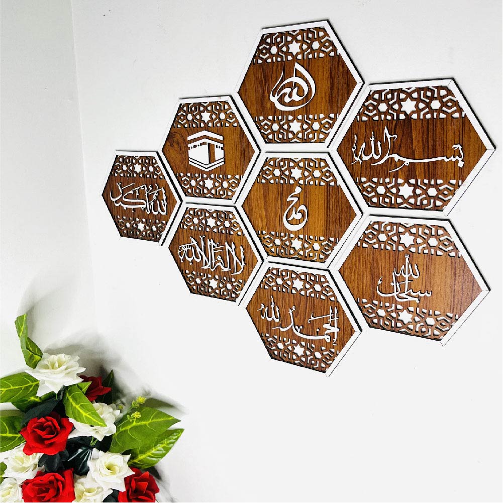 An 8-piece hexagonal wall art set forming a 30×24 inch honeycomb pattern. Features Islamic art and text in white against a warm brown wooden background. A unique and eye-catching geometric display.
