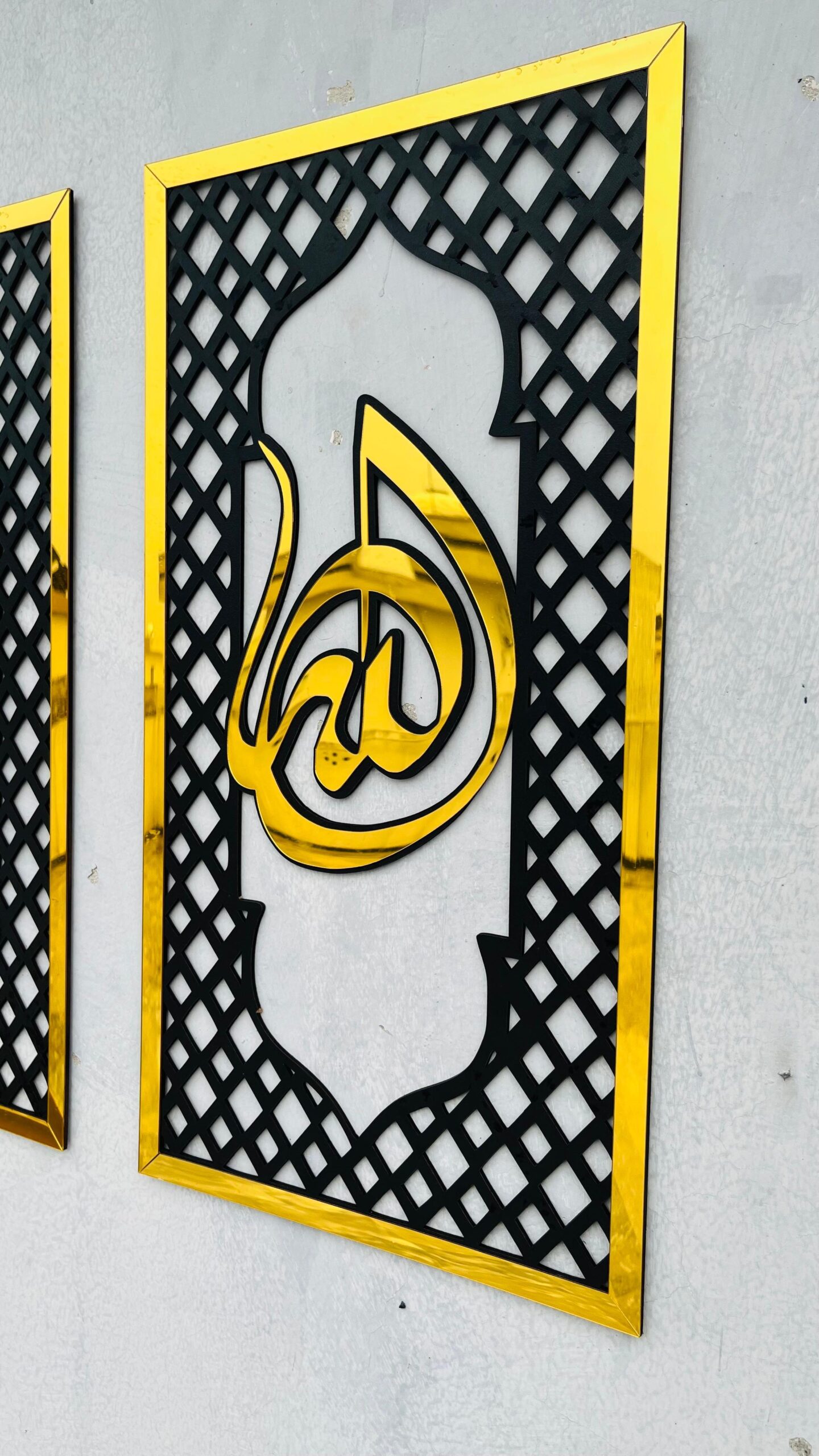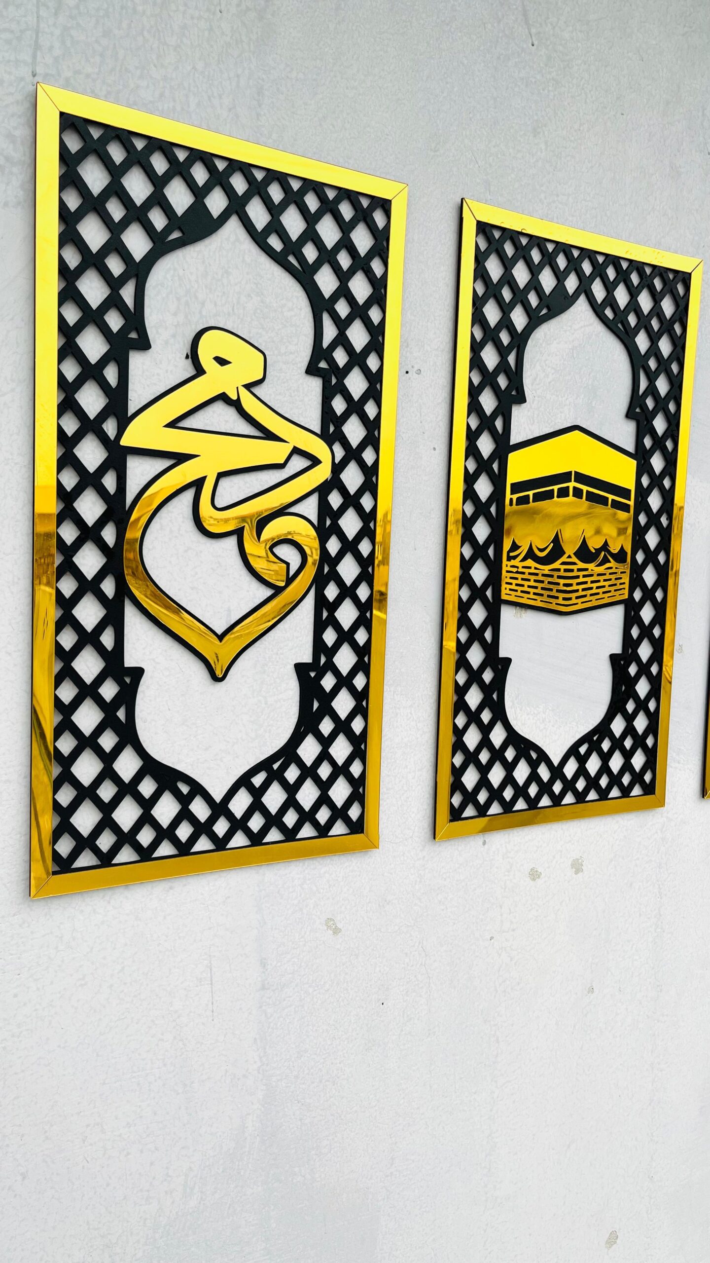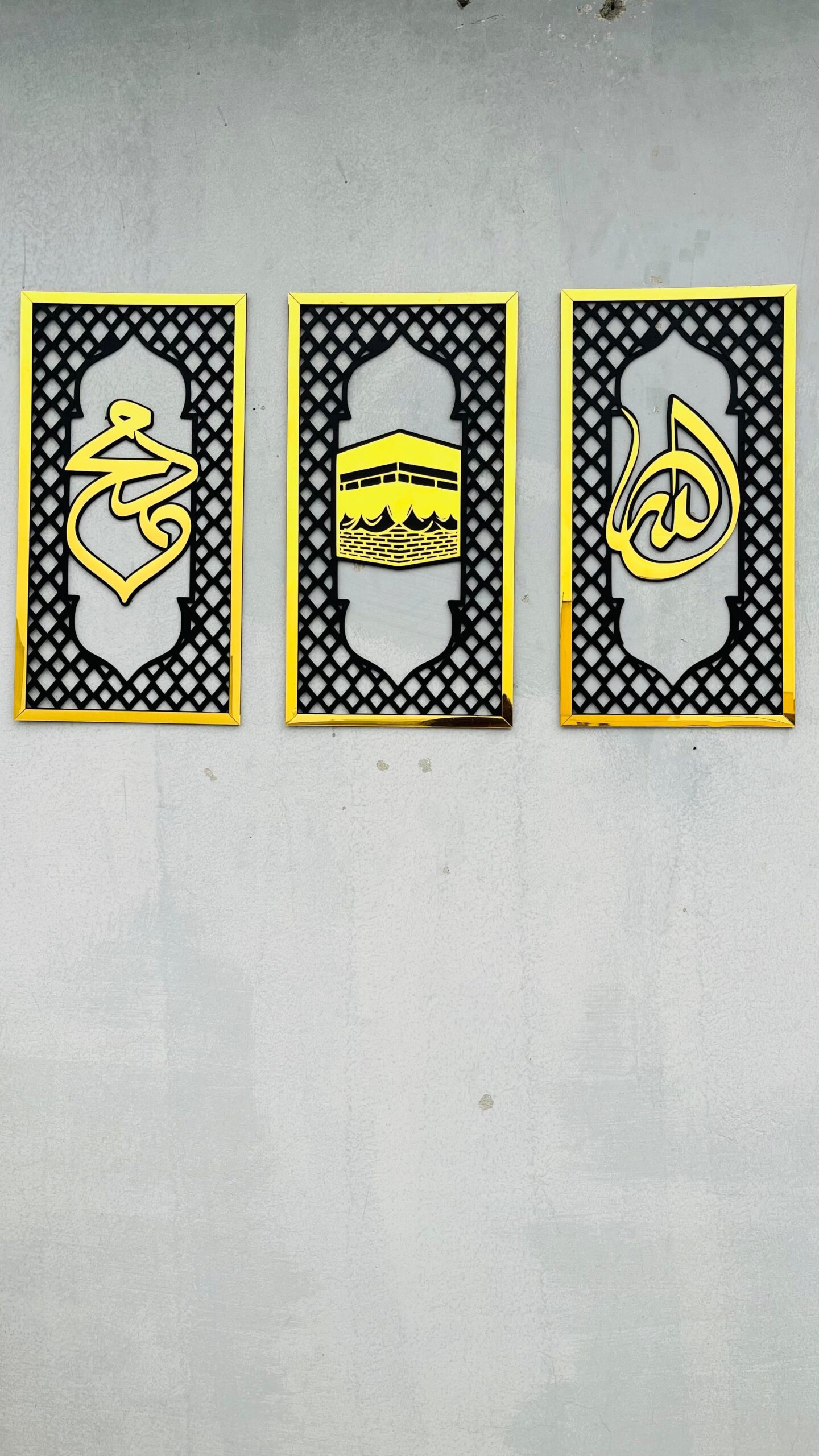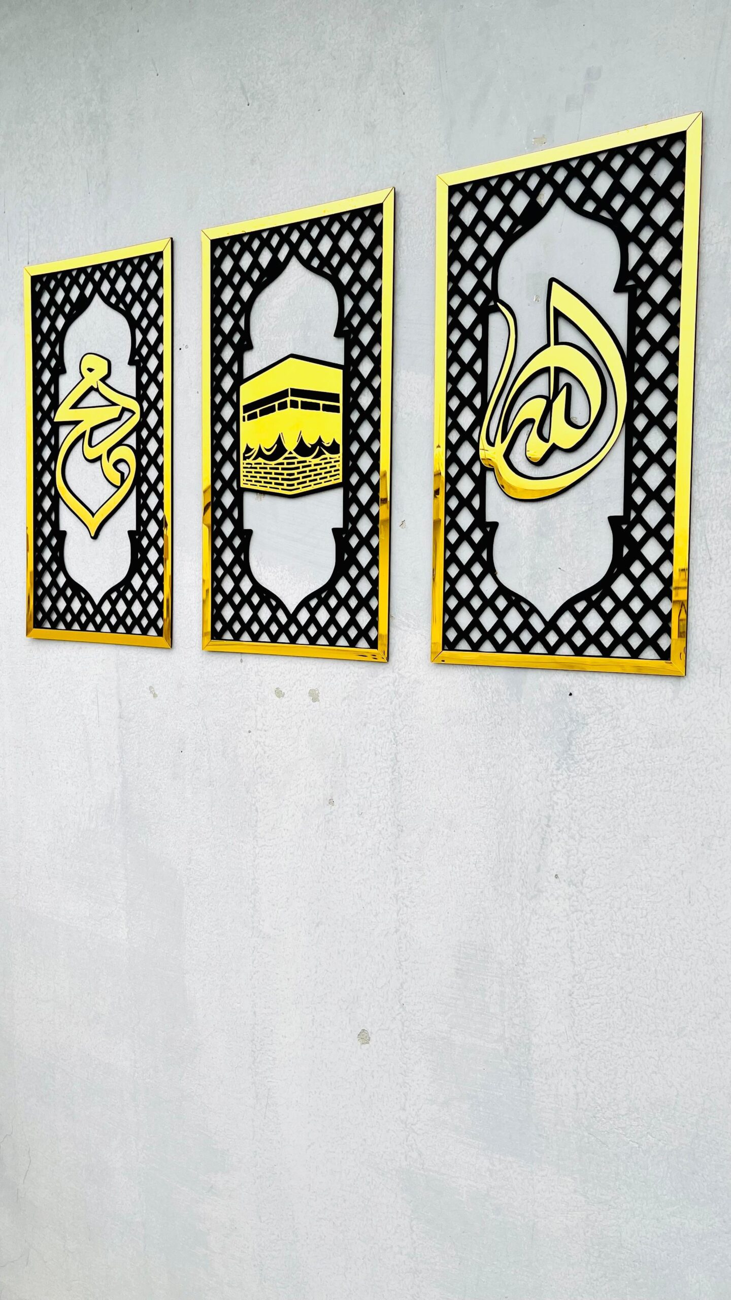 Embrace a modern interpretation of sacred Islamic elements with Design 02. This elegant set presents the holy name of “Allah”, a graceful silhouette of the Holy Kabah, and the revered name of Prophet Muhammad (PBUH) across three tall, slender panels. Designed with a contemporary aesthetic, this trio brings a minimalist yet deeply spiritual presence to your space.