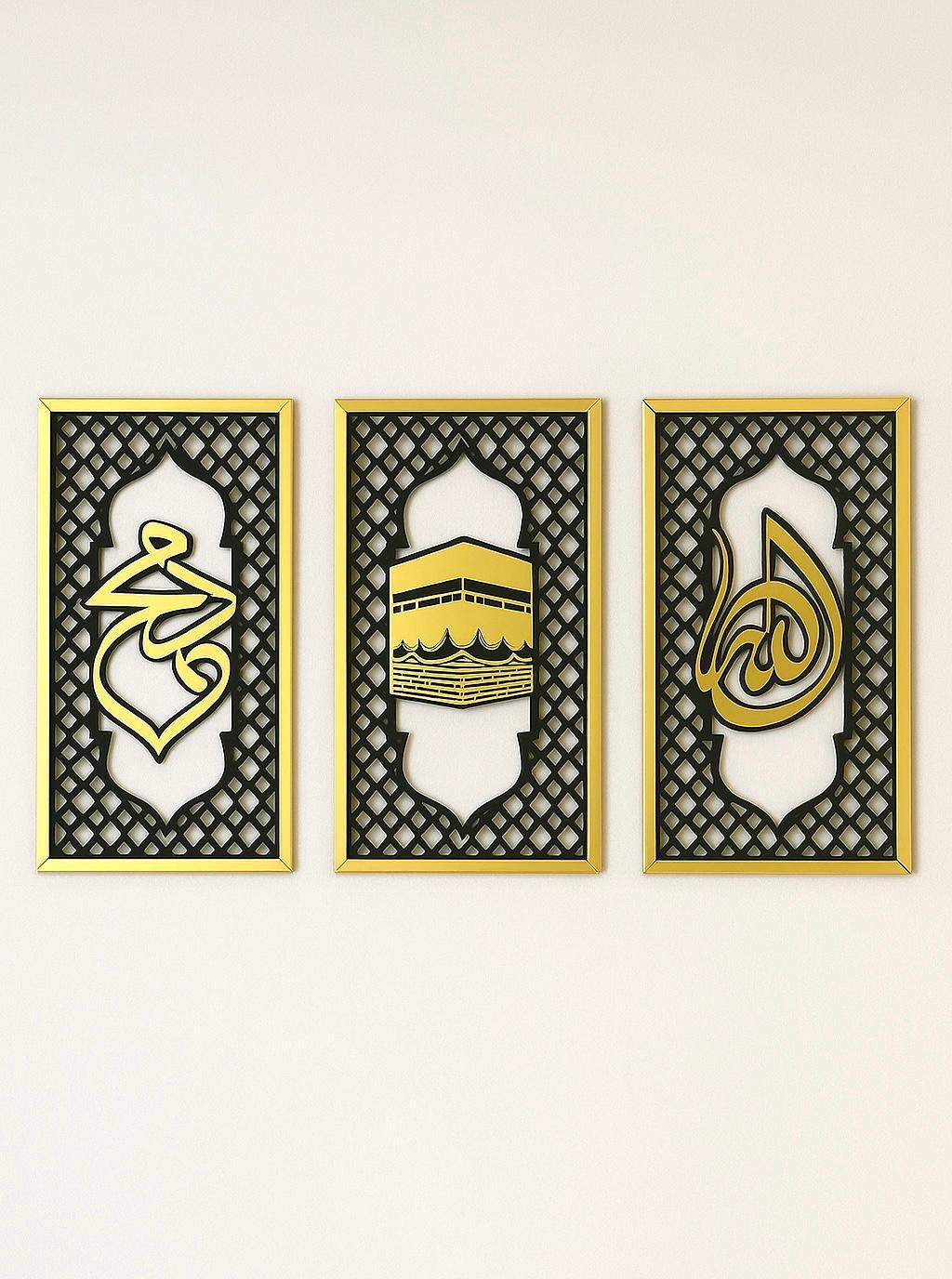 Allah, Kabah, Muhammad Design 02 – Slender Islamic Wall Art Trio (24″x20″ Overall)