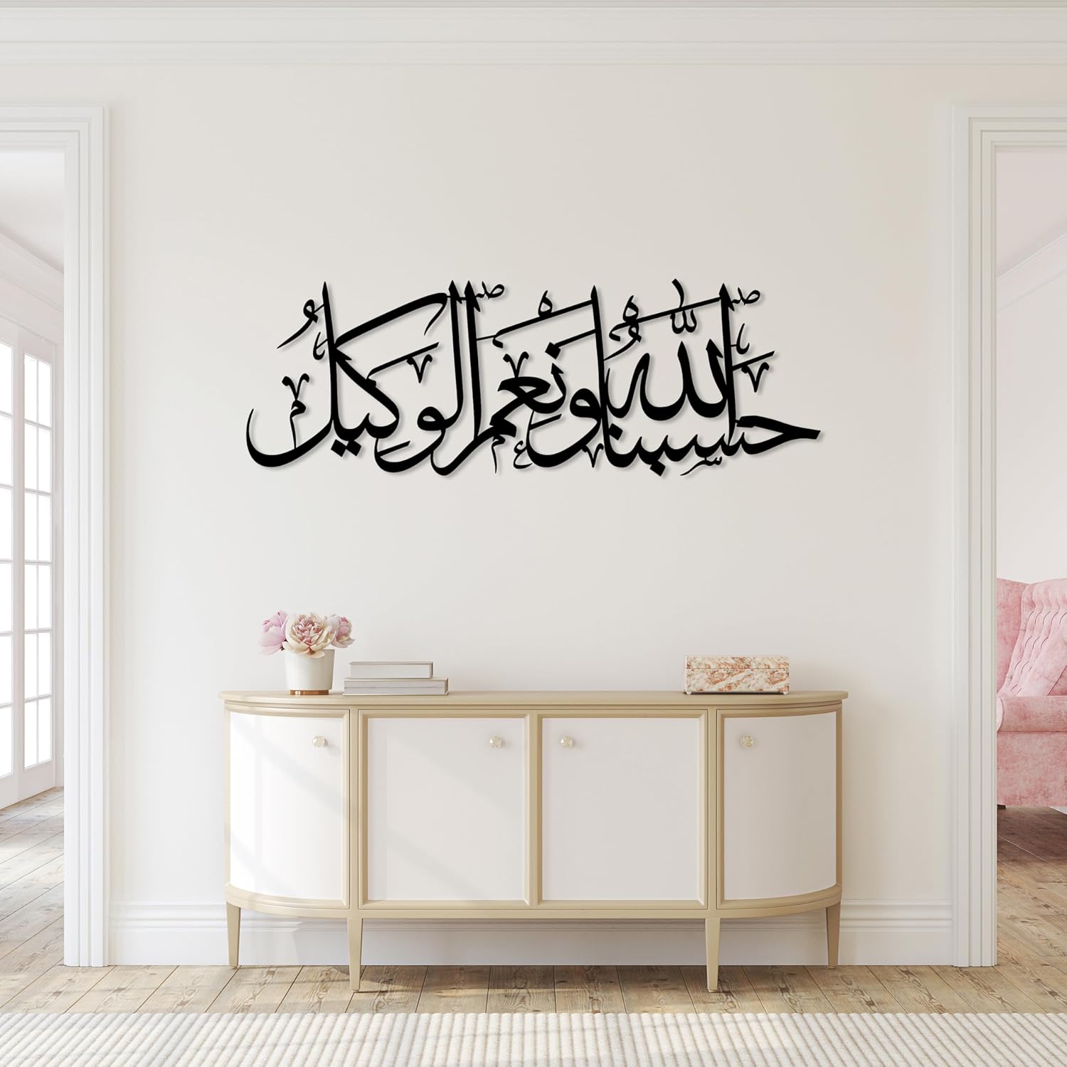 “Hasbunallah wa Ni’mal Wakeel” in elegant Arabic calligraphy, laser-cut from black wood. A spiritual reminder of trust in Allah. Size: 8×24 inches.