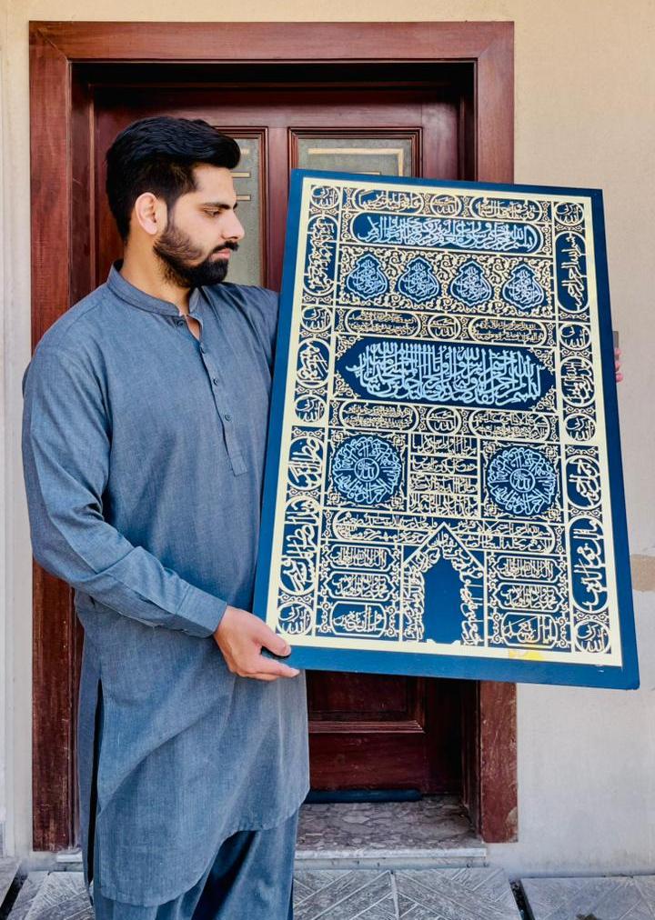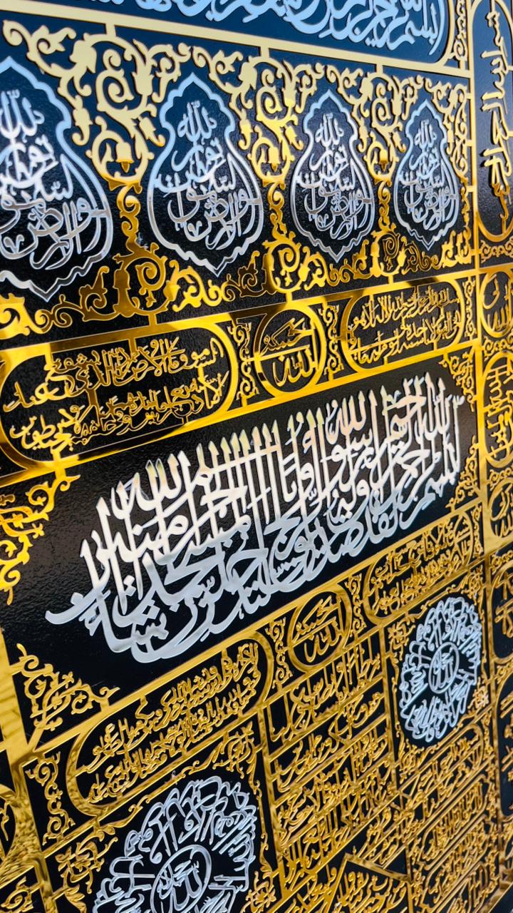 Inspired by the sacred Kiswah (the cloth draping the Holy Kaabah), this framed artwork captures intricate gold-embroidered calligraphy and fabric-like texture. The black variant reflects the traditional grandeur seen in Makkah, , celestial aura – perfect for modern Islamic interiors.