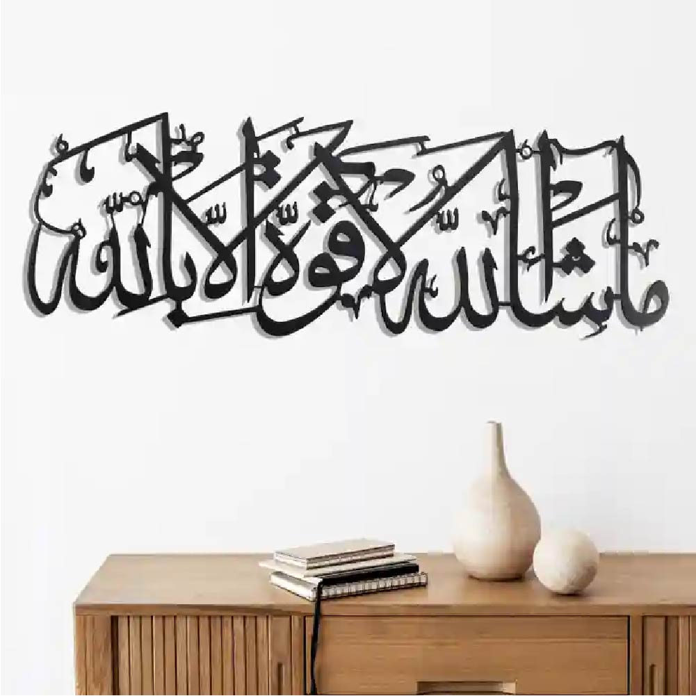 “ما شاء الله لا قوة إلا بالله” (“Mashallah, there is no power except with Allah”) in elegant calligraphy. Available in black wood or golden acrylic finishes.