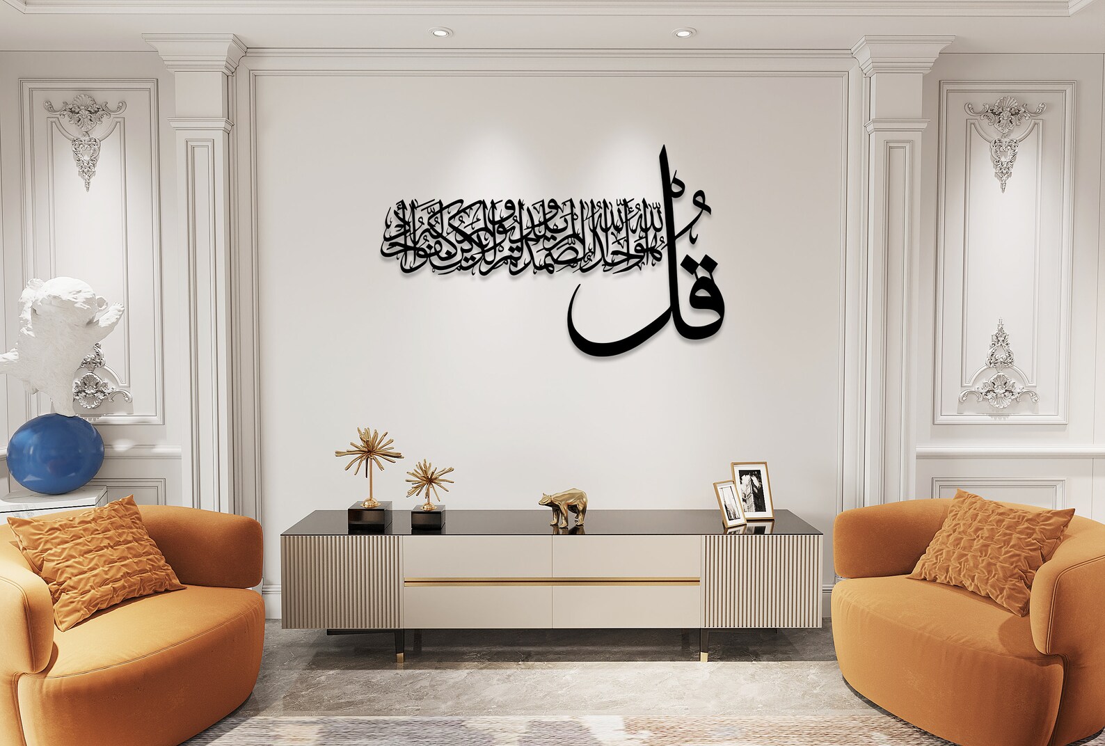 The sacred word “Qul” (قُلْ) in elegant Islamic calligraphy. Available in golden acrylic, silver acrylic, or black wooden finishes. Size: 12×24 inches.